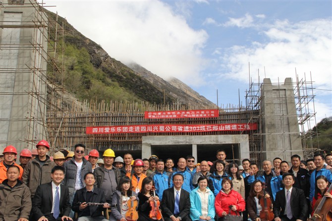 6月4日,"四川愛樂樂團走進四川興蜀公司映臥路、巴郎山隧道工地"在海拔3800米的巴郎山隧道出口激情奏響,受到一線參建者們的熱烈歡迎。到達現場后,演奏家們不顧疲勞,用優美的旋律演奏了《窗花舞》、《梁祝》、《在水一方》、《我的太陽》、《藍色多瑙河》、《同一首歌》等經典樂曲,其中穿插了巴郎山參建者的自備獨唱節目《火苗》和現場即興表演等節目,將演出現場的氛圍推向了高潮,演奏家們敬業的態度、務實的作風和精湛的表演才能,使一線參建者們深受感動,為參建者們樹立了榜樣。
