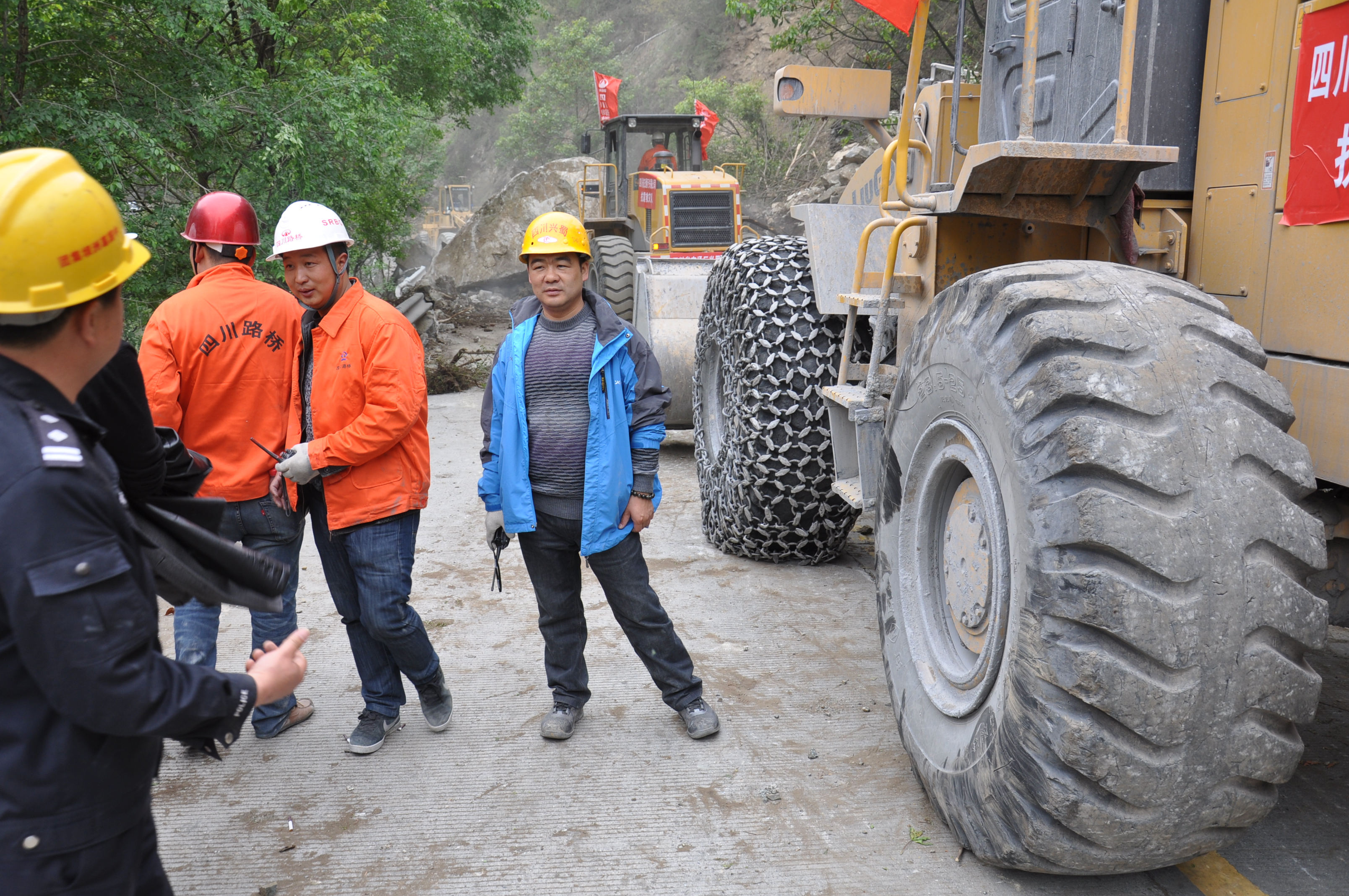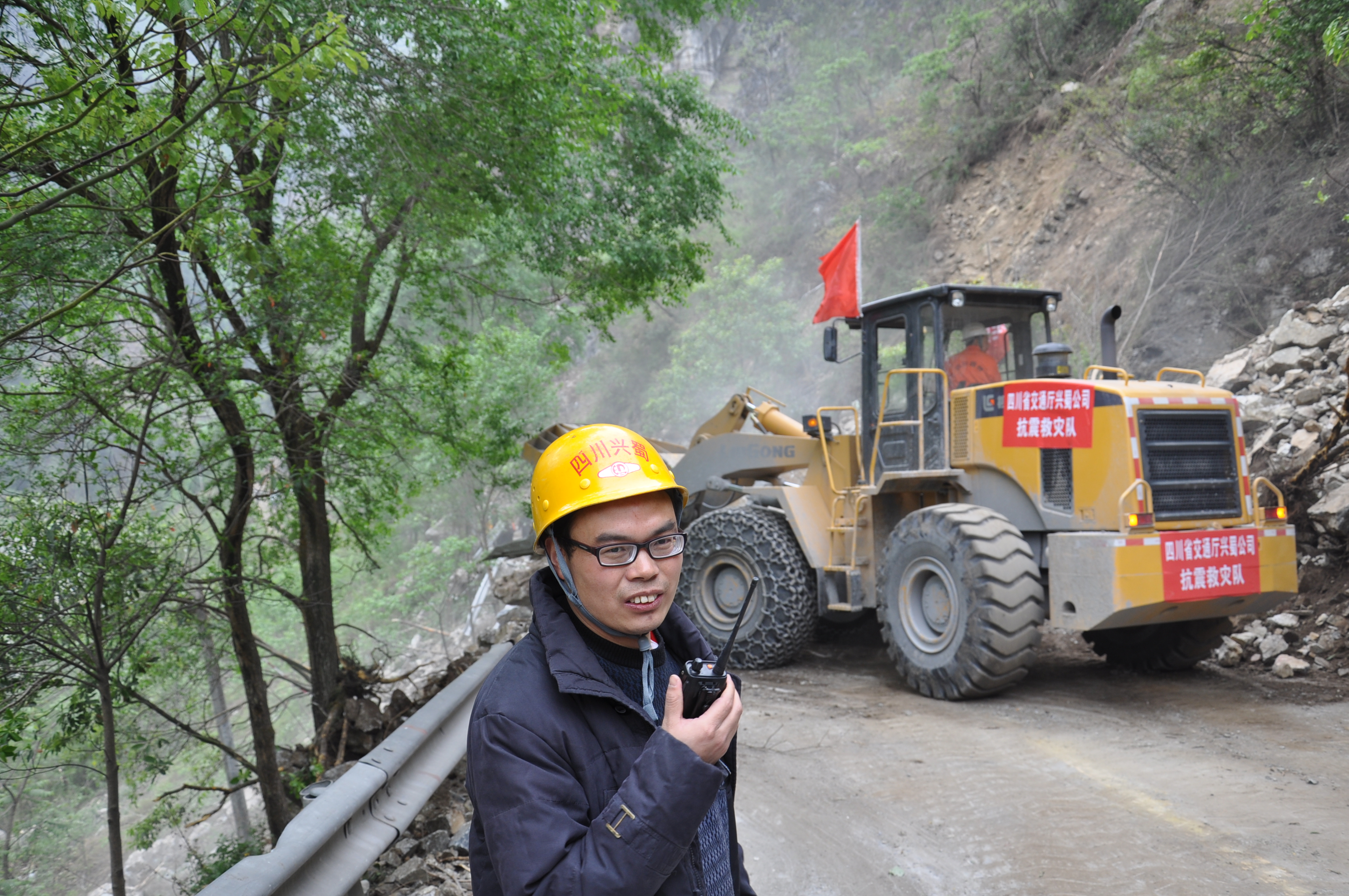 從夾江到成都,成都到映秀,映秀到日隆,日隆到蜂桶,輾轉(zhuǎn)560余公里于21日中午同大部隊會合。一路上他邊采購物資,邊組織后續(xù)馳援機械。和第一批搶險隊會合后,他帶領(lǐng)后續(xù)生力軍顧不得休息立即投入到搶通老關(guān)口的戰(zhàn)斗中。他不斷的爬上裝載機,頭頂飛石拍攝災(zāi)害點圖片,然后和同事們看著圖片分析災(zāi)害變化,及時調(diào)整和優(yōu)化搶通方案,努力確保安全作業(yè)和盡早突破老關(guān)口瓶頸。他手持對講機邊觀察飛石,邊給機手加油鼓勁。在大家的共同努力下,歷時四個小時打通老關(guān)口飛石區(qū)。他負(fù)責(zé)從北端疏散受阻群眾,無一人受傷。