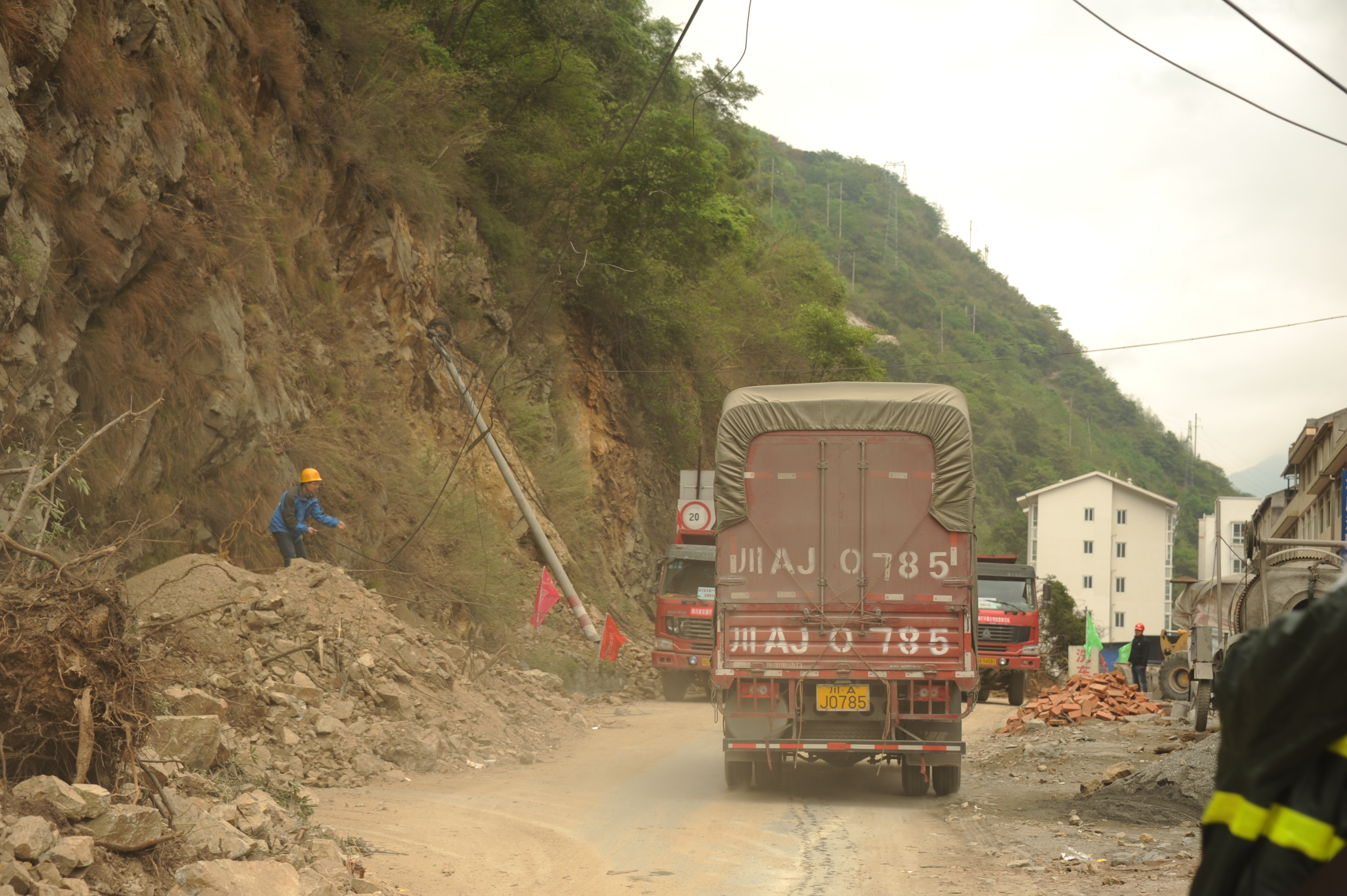 興蜀公司映臥路代表處業(yè)主代表盧宗兵受命指揮該處道路搶通和加寬。突然一塊飛石下來砸在路旁本已搖搖欲墜的電桿上,電桿應(yīng)聲而到。高壓線下是一部正在作業(yè)的挖掘機,眼看高壓線就要砸在挖機上了,盧宗兵路邊急中生智操起一節(jié)竹竿沖過去頂在高壓線下,高壓線在距挖機頂約20公分的位置被頂住。盧宗兵站在坍方體上,手持竹竿頂著高壓線,堅持了20余分鐘。直到同事們找來一根木樁頂住高壓線,并完成固定后,他才松手走到安全地帶。期間,又有幾塊飛石陸續(xù)落下,好在他都幸運躲過。