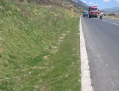 全線漿砌片石、砼邊溝、排水溝的原有設計,既增加了工程造價,又不利于公路與周邊環境的自然天成。為此,省道216\217理亞路指揮部、設計院等多次積極與參建單位針對該項目特點進行研究探索并實地踏勘,確定了在原水溝以下加設縱向盲溝達到排水目的,在除設置有上擋的段落保留砼邊溝外,其余段落均設置成淺蝶形土溝的設計,并在其上鋪設草皮,以減少人工痕跡,讓公路自然天成,與周圍環境渾然一體。
