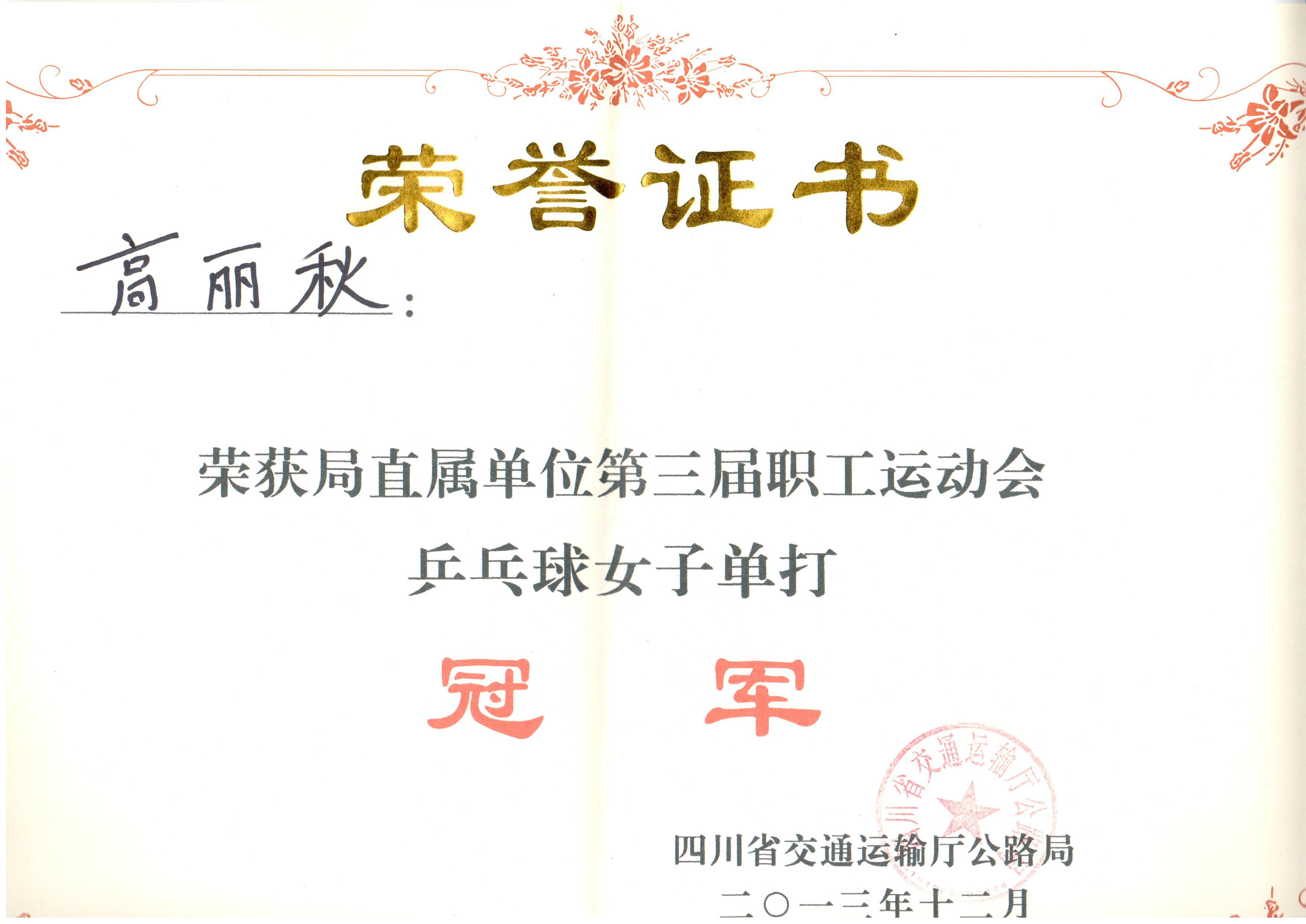 12月28日,在局直屬單位第三屆職工運動會比賽中,公司參賽員工展現了奮勇爭先、斗志昂揚的拼搏精神,最終高麗秋獲得乒乓球女子單打冠軍的佳績。