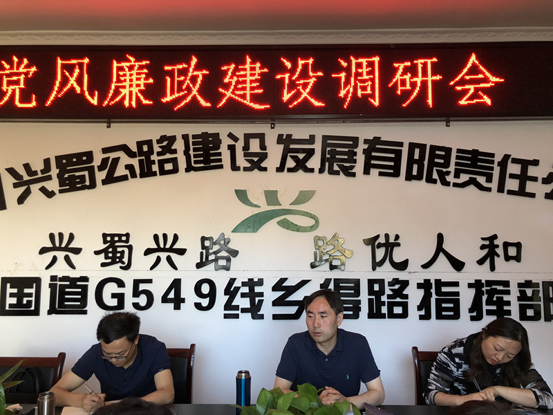 調研組一行沿途調研了理亞路、東海路、桑然路、鄉得路、亞赤路等項目建設情況,并赴桑然路、鄉得路指揮部與駐地現場工作人員召開座談會。會上,指揮部向調研組匯報了興蜀公司所承接的甘孜片區項目建設情況、黨風廉政建設工作情況。杜組長對興蜀公司甘孜片區項目建設各項工作成果表示充分肯定,并高度贊揚了建設者們在高寒缺氧、氣候、地質條件惡劣的環境下,不畏艱險、頑強拼搏的奉獻精神,要求各參建單位要以建設廉潔工程為己任,認真貫徹執行各項紀律、規矩,業主和代建單位要充分發揮職能部門的監督作用,既要堵“后門”,也要開“前門”,確保紀檢監察干部的權力在陽光下正確充分地行使,最后杜組長強調要創新廉政教育方式,利用好新媒體,做好“點滴紀檢”和“紀檢微平臺”的宣傳工作,讓所有交通人共同關注紀檢工作,打造風清氣正的良好政治生態。