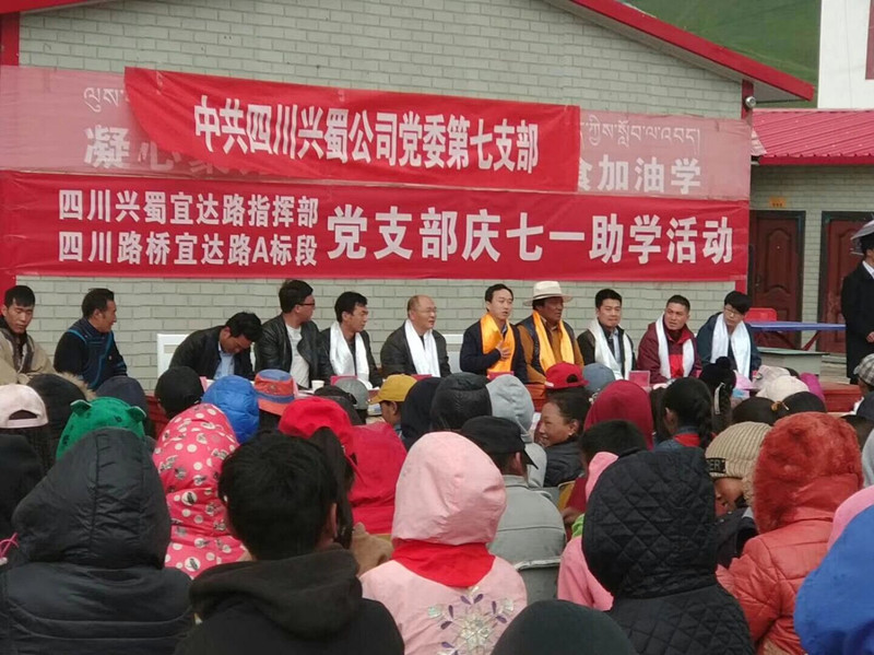 在中國共產黨建黨97周年之際,2018年6月29日,興蜀公司第七黨支部、四川路橋宜達路黨支部、鎮江路橋宜達路黨支部到石渠縣阿日扎鎮中心校開展慶“七一”愛心助學活動,為鎮中心校、麻曲村小捐贈了助學資金5000元和價值2萬元的書包、文具、籃球等文體用品。興蜀公司副總經理潘華同志表達了對全體小朋友的殷切希望和對全體教職工的謝意,勉勵小朋友好好學習、天天向上,將來回報社會、報效祖國。鎮黨委書記降擁代表鎮政府、鎮中心校和麻曲村小全體師生向興蜀公司和路橋公司表達了最真誠的謝意,感謝他們對阿日扎公路建設和牧區教育的無私奉獻。