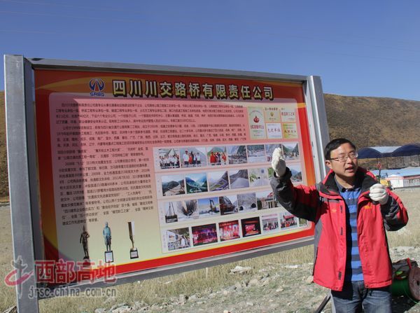 四川興蜀公路公司G318線東海路改建工程項目指揮部指揮長助理楊朝富正在介紹獨具民族特色的卡子拉山觀景臺設計。