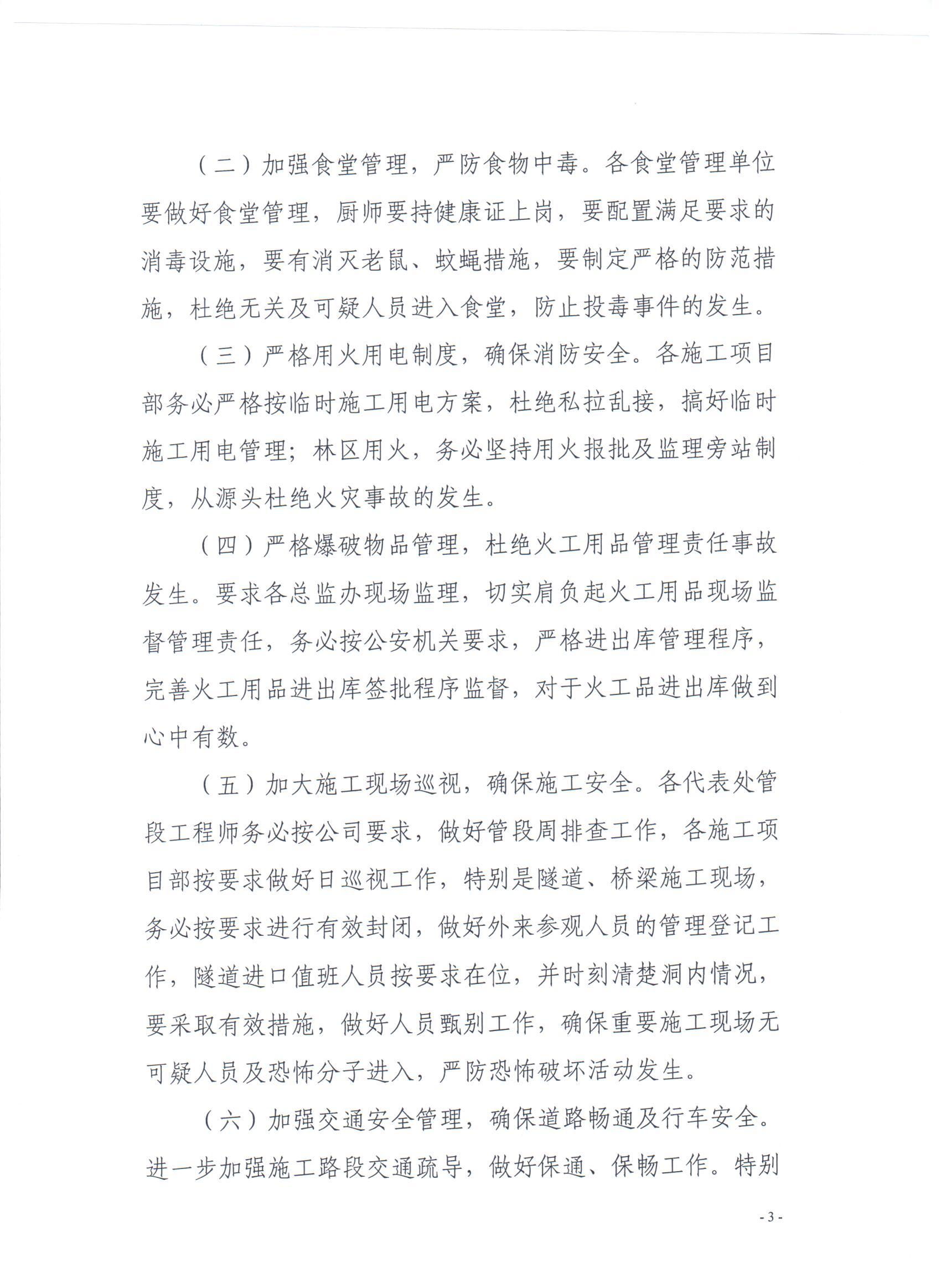 (五)加大施工現場巡視,確保施工安全。各代表處管段工程師務必按公司要求,做好管段周排查工作,各施工項目部按要求做好日巡視工作,特別是隧道、橋梁施工現場,務必按要求進行有效封閉,做好外來參觀人員的管理登記工作,隧道進口值班人員按要求在位,并時刻清楚洞內情況,要采取有效措施,做好人員甄別工作,確保重要施工現場無可疑人員及恐怖分子進入,嚴防恐怖破壞活動發生。
