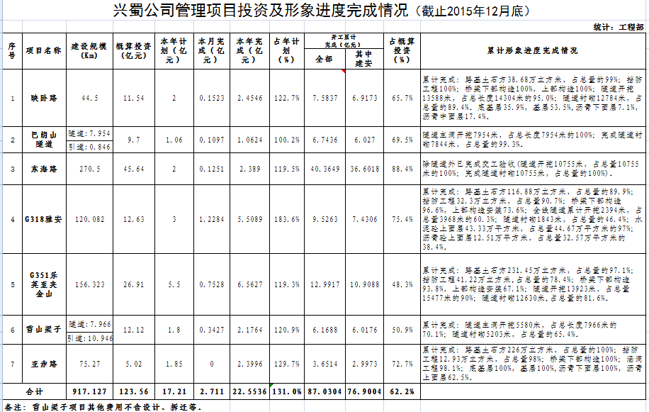 興蜀公司管理項目投資及形象進度完成情況(截止2015年12月底)