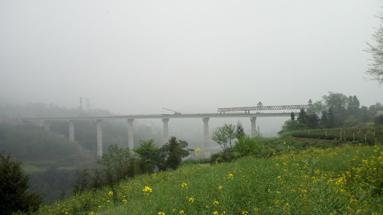 靈關河1#大橋跨越山間谷地,地勢起伏高,上部結構為9×40米預應力混凝土T梁,墩柱設計為空心薄壁變截面墩,其中最高墩柱,距離地面凈空高達78米。興蜀公司G351線建設指揮部和各參建單位通過優化施工方案,調整施工工藝,精心組織管理,努力克服施工難度系數大,安全風險嚴峻,征拆困難等不利因數,在保證大橋安全架設的前提下,實現了靈關河1#大橋的順利架通。