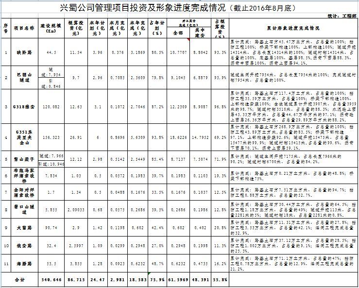 興蜀公司管理項目投資及形象進度完成情況(截止2016年8月底)