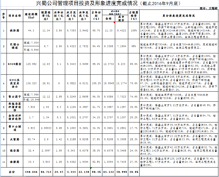 興蜀公司管理項目投資及形象進度完成情況(截止2016年9月底)