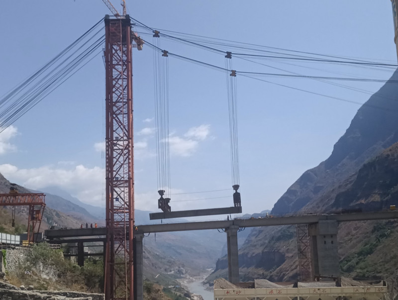 該項目橋梁板采用纜索吊裝系統架設,分為兩階段組織施工。一階段任務是完成主拱39片梁板吊裝,二階段是完成引橋架設。二階段的吊裝工作因緊靠索塔部位實施,須承受較大的反向牽引力,索塔受力后變形較大,對施工技術和安全構成極大考驗。為確保萬無一失,項目指揮部高度重視,精心組織,從吊裝安全方案論證、計算推演,到最后的組織實施,層層把關,攻克了引橋墩架設關鍵技術性難題,實現了工程質量安全總體受控。