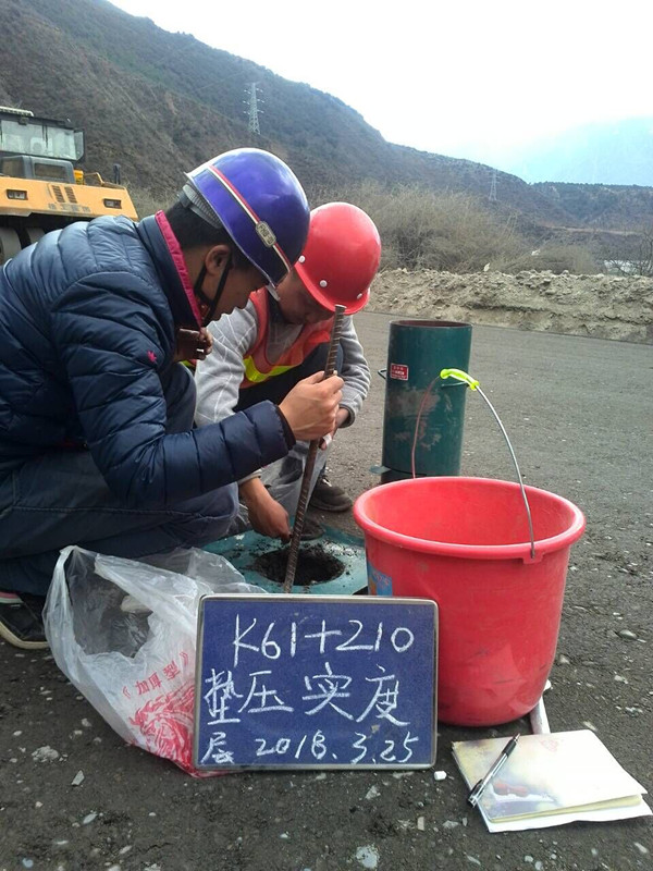 此次鋪筑K41+000~K41+200試驗段,墊層頂面寬度8.2米,底面寬度8.5米,設計厚度0.15米。興蜀公司桑然路指揮部組織總監辦、監理實驗室、施工單位完成原材料檢測、配合比設計、施工方案審核、施工測量放樣、混合料攤鋪、松鋪高程測定、橫坡平整度檢測等一系列工序后,采用攤鋪機鋪筑級配碎石墊層,經20T鋼輪壓路機4遍碾壓、30T膠輪壓路機2遍碾壓,路面壓實度達到97%,級配碎石密實板結,路面平整、線形順直,完全符合設計指標要求,為桑然路下一步實施路面水穩層攤鋪施工奠定了基礎。