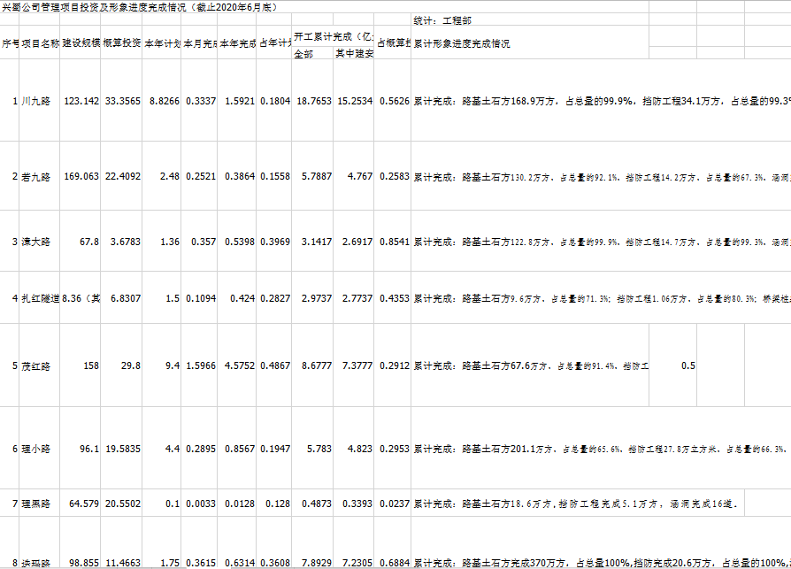 興蜀公司管理項目投資及形象進度完成情況(截至2020年6月底)