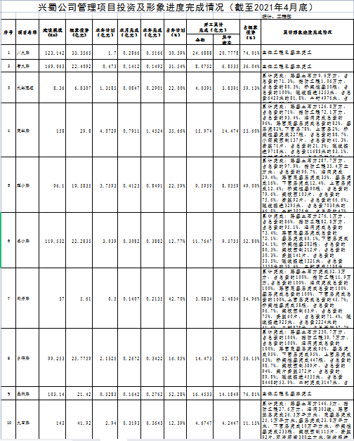 興蜀公司管理項(xiàng)目投資及形象進(jìn)度完成情況(截至2021年4月底)