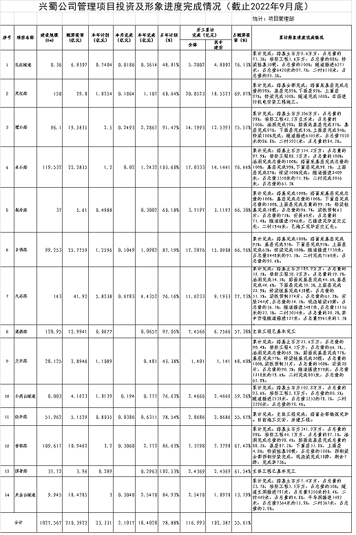 興蜀公司管理項目投資及形象進度完成情況(截止2022年9月底)