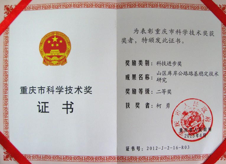 日前,我公司科研課題《山區(qū)庫岸公路路基穩(wěn)定技術研究》,榮獲重慶市人民政府2012年度“重慶市科技進步獎”二等獎。柯勇總經理、袁泉總工程師分獲個人二等獎。