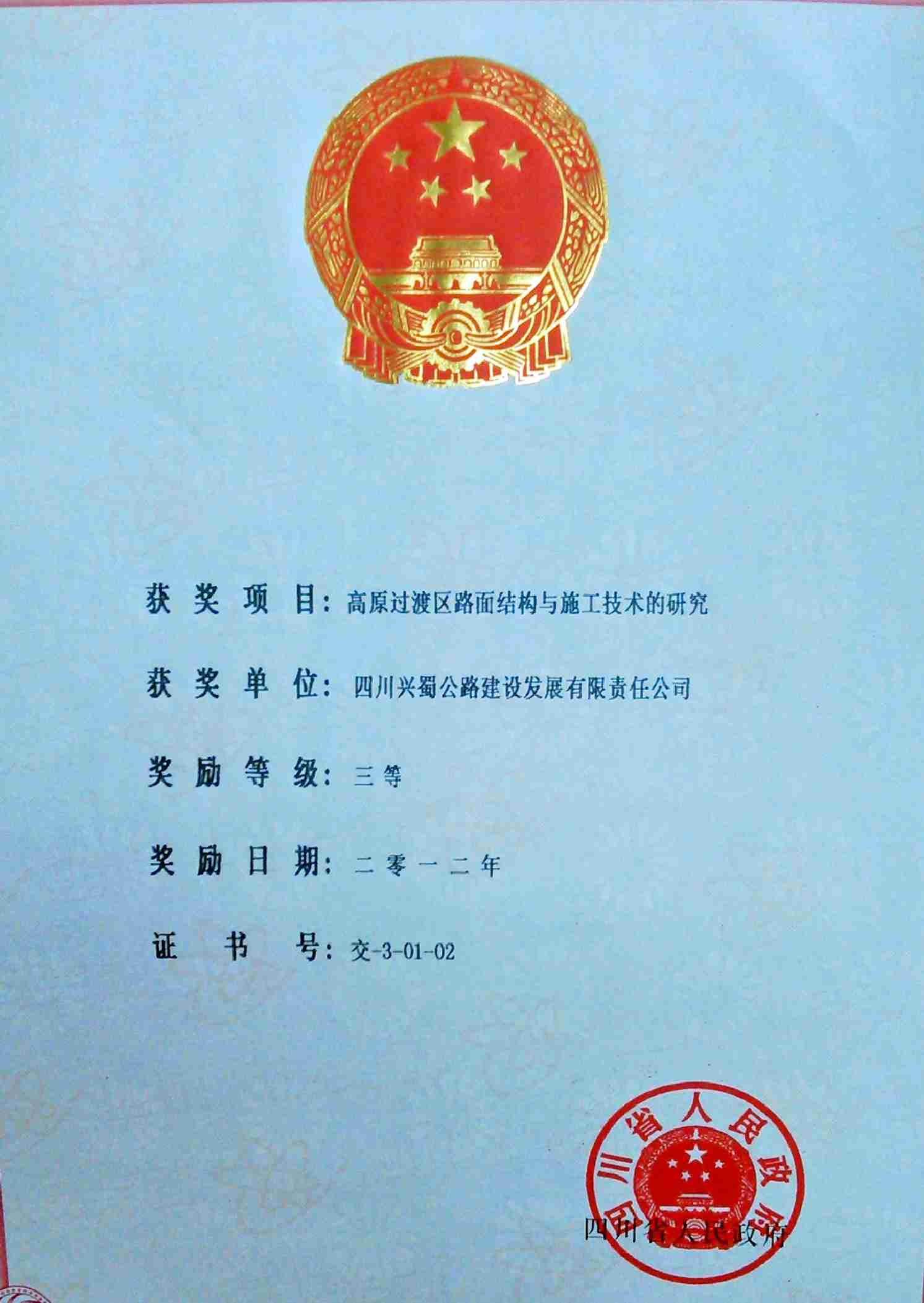 日前,我公司科研課題《高原過渡區路面結構與施工技術的研究》,榮獲四川省人民政府2012年度“四川省科技進步獎”三等獎。