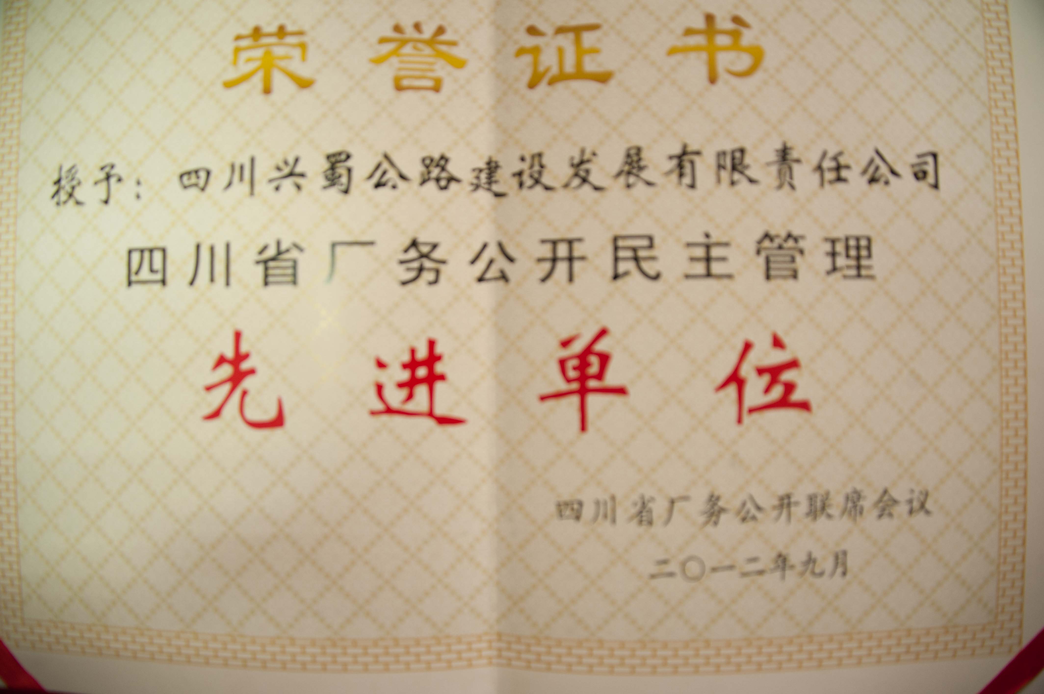 公司日前榮獲“四川省廠務(wù)公開民主管理先進(jìn)單位”榮譽(yù)稱號(hào)。